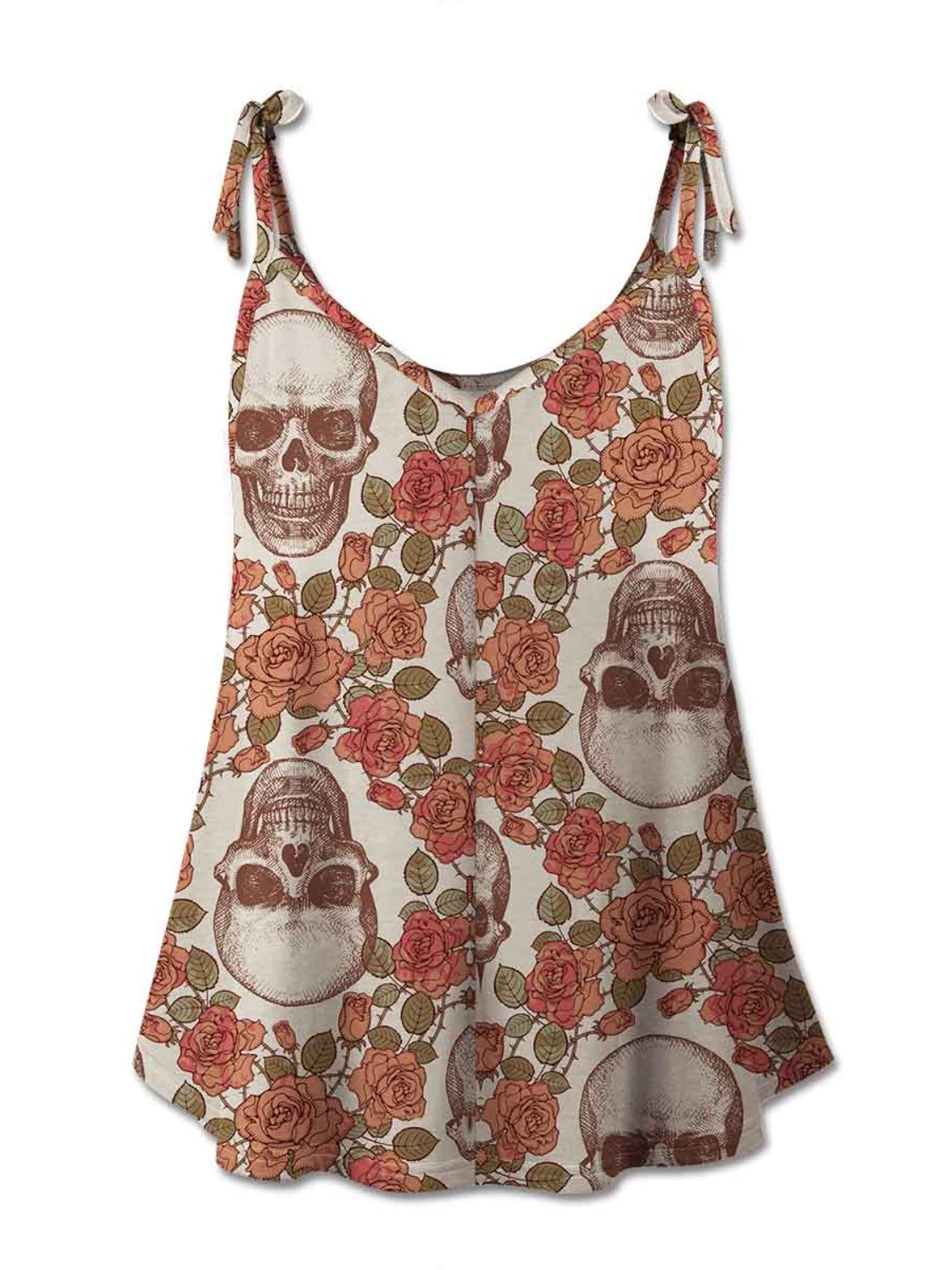 “The Roses Skull” Scoop Neck Tie Shoulder Cami